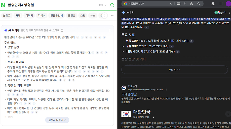 검색결과에 대한 탐색과 선택을 생략해주는 AI 요약 답변 (사진: 네이버, 구글) |