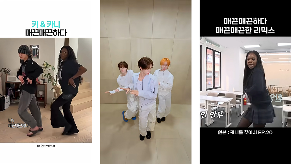 지금 막 유행하기 시작한 밈이 있어서 호다닥 가져왔어요. 바로 카니의 '매끈매끈푱푱울퉁불퉁' 노래인데요. 카니는 요즘 SNS에서 자주 보이는, 비욘세의 안무가로 유명한 댄서예요. K-아이돌들의 안무를 만든 인물이기도 하죠.