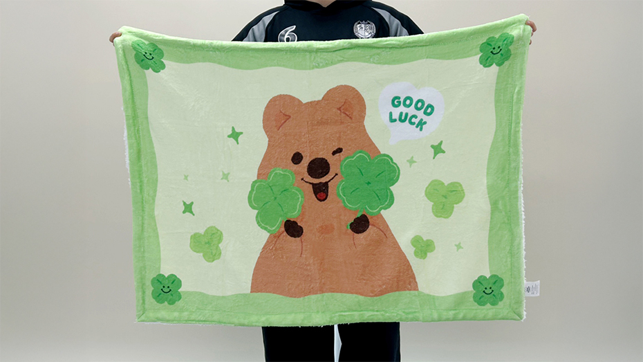 큐레터의 마스코트인 쿼카가 네잎클로버를 들고 'GOOD LUCK'을 외친다니 벌써 귀엽고 행운이 들어올 것만 같고 그래요. 양털 극세사(안감은 흰색)로 되어 있어서 만지면 보들보들하고 포근하답니다.