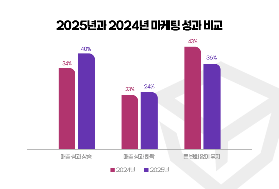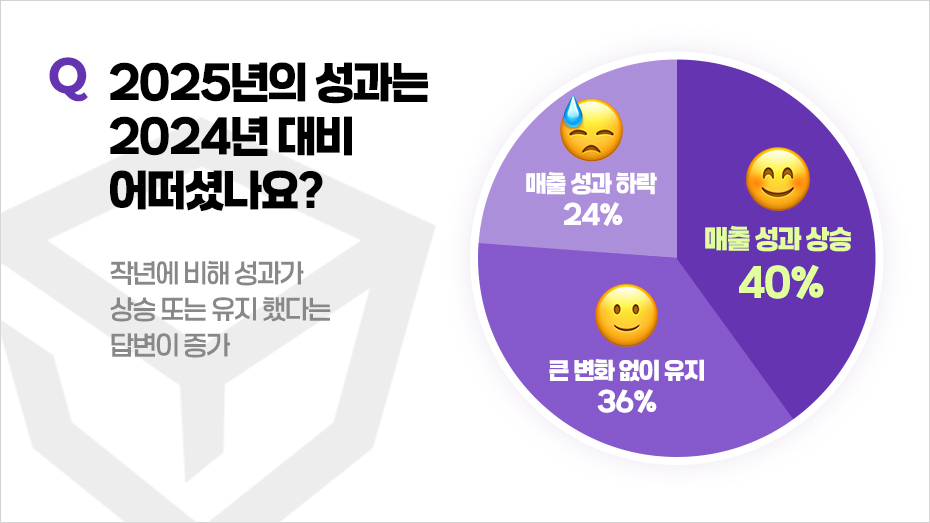 ์ฑ๊ณผ๋ฅผ ๋ฌป๋ ์ง๋ฌธ์ ๋ํด์๋ ๋งค์ถ ์ฑ๊ณผ๊ฐ ์์นํ๋ค๋ ์๋ต์ด 40%๋ก ๊ฐ์ฅ ๋ง์์ด์. ํฐ ๋ณํ ์์ด ์ ์ง(36%), ๋งค์ถ ์ฑ๊ณผ ํ๋ฝ(24%) ์์ด์์.